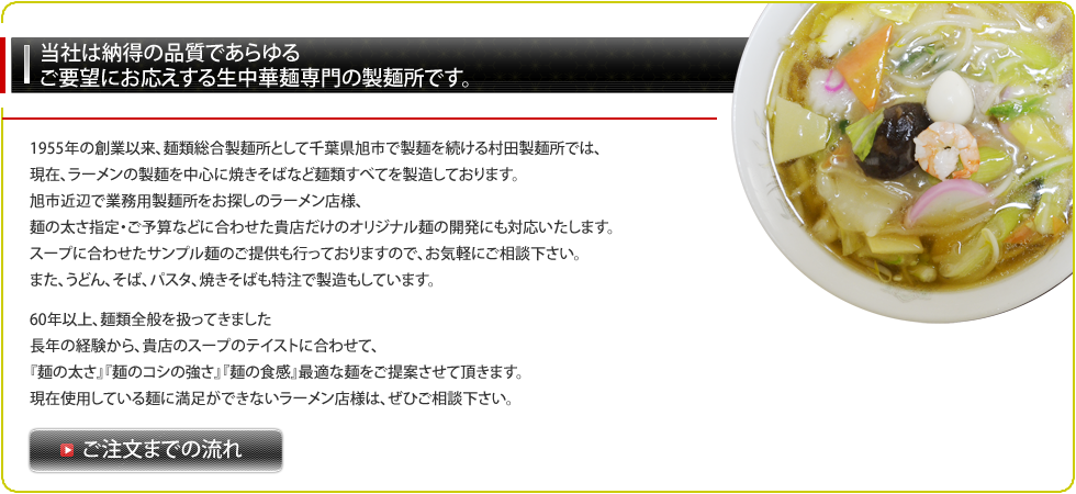 村田製麺所は創業60年の経験を活かしオーダメイドで業務用製麺、中華麺等の様々な麺をおつくりします。まずはサンプルでお試し下さい!!